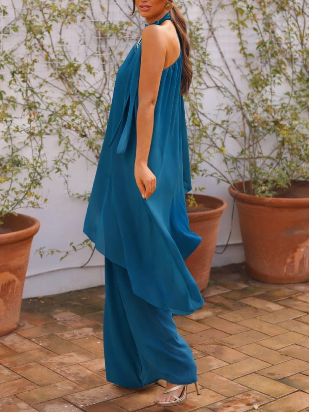 Mono largo con capa. Tejido de gasa ideal para evento. Lazo al cuello. Lleva elástico en la cintura. El pantalón lleva forro tipo pantalón corto. Talla única hasta 42 máximo